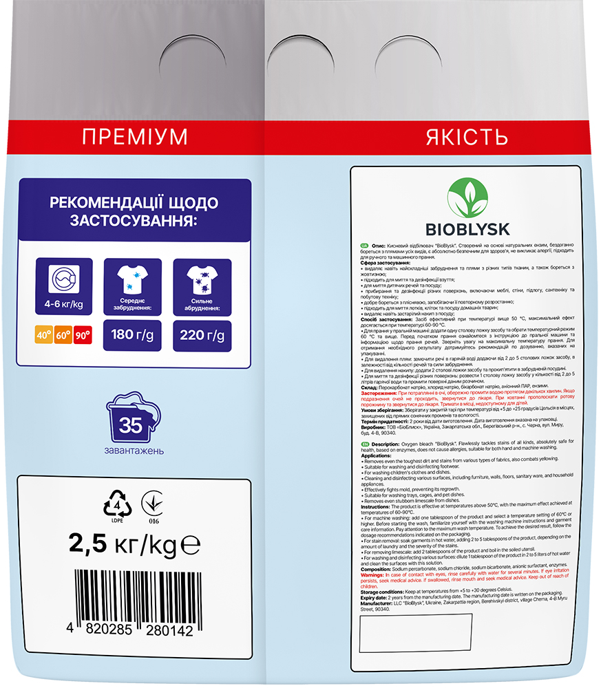 • For washing in a washing machine: add one tablespoon of the product and choose a temperature regime of 60 °C and above. Before washing, read the instructions for the washing machine and information on washing things. Pay attention to the maximum washing temperature. To get the desired result, follow the dosage recommendations indicated on the packaging.