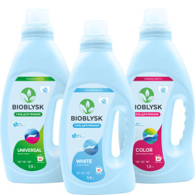 • Washing gel “Universal” BioBlysk 1.5 l is a universal gel that is suitable for washing all types of fabrics, providing effective removal of dirt and preserving the freshness of the fabric.