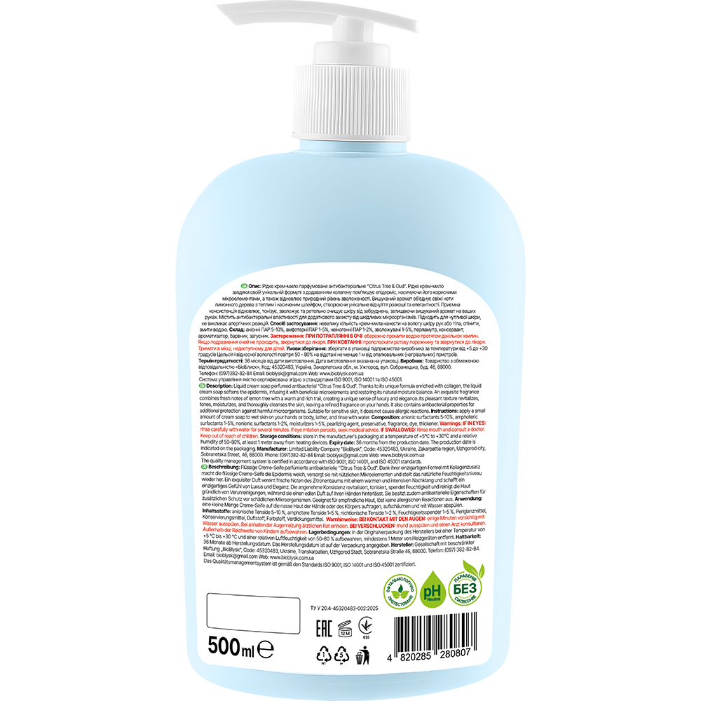 Liquid cream-soap perfumed antibacterial "Citrus Tree & Oud". Liquid cream soap due to its unique formula with the addition of collagen softens the epidermis, saturating it with useful trace elements, and also restores the natural level of hydration. The exquisite aroma combines fresh lemon tree notes with a warm and rich plume, creating a unique sense of luxury and elegance. Pleasant consistency restores, tones, moisturizes and thoroughly cleanses the skin of impurities, leaving an exquisite aroma on your hands. Contains antibacterial properties for additional protection against harmful microorganisms. Suitable for sensitive skin, does not cause allergic reactions.