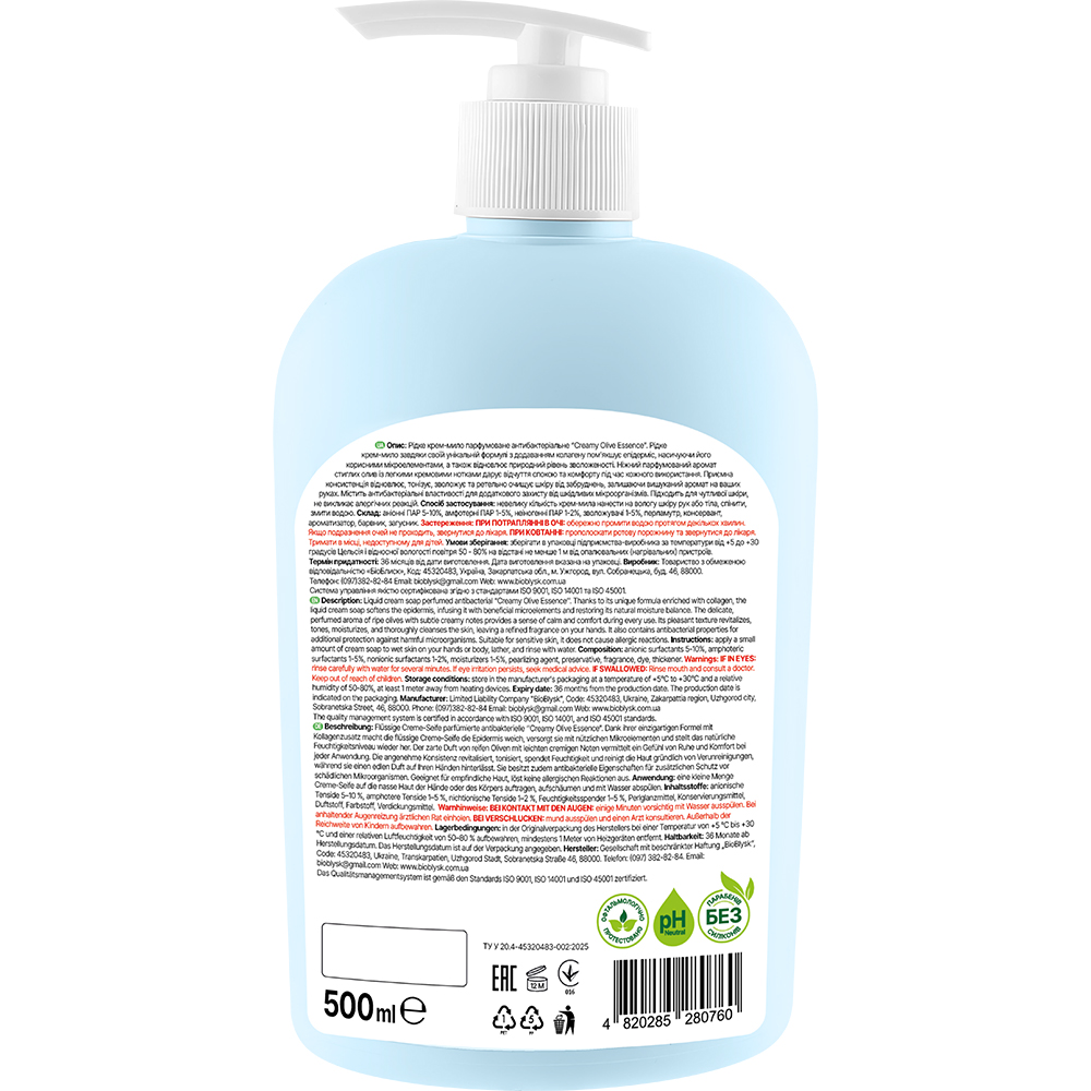 Liquid cream soap perfumed antibacterial "Creomy Olive Essence". Liquid cream soap due to its unique formula with the addition of collagen softens the epidermis, saturating it with useful trace elements, and also restores the natural level of hydration. A delicate perfumeed scent of ripe oils with light creamy notes gives a sense of peace and comfort during each use. Pleasant consistency restores, tones, moisturizes and thoroughly cleanses the skin of impurities, leaving an exquisite aroma on your hands. Contains antibacterial properties for additional protection against harmful microorganisms. Suitable for sensitive skin, does not cause allergic reactions.