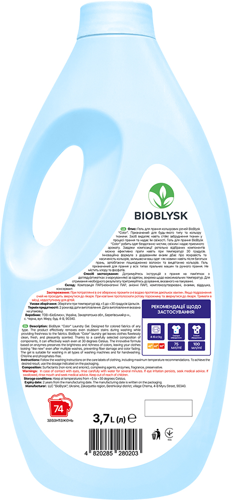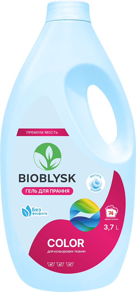 Designed for any type and color of the fabric. The product removes even persistent tissue contamination during the washing process and gives them freshness. Washing gel BioBlysk “Color” makes the clothes flawlessly clean, fresh and give a pleasant aroma. Thanks to the composition of carefully selected components, you can effectively wash even at a temperature of 30 degrees. An innovative formula with addition enzyme takes care of the brightness and color saturation, leaving your clothes "as new" even after many washes, preventing fiber damage and color fading. The gel is designed for washing in all types of washing machines and hand washing. Does not contain chlorine and phosphates.