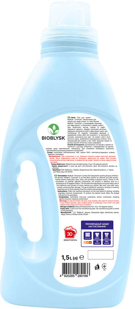 Designed for washing all types of fabrics and types of linen. BioBlysk “Universal” is an innovative solution for effective and safe washing, makes clothes flawlessly clean, fresh and give a pleasant aroma. Thanks to the composition of carefully selected components, the product is effective even at a temperature of 20 degrees. An innovative formula with addition enzyme takes care of the brightness and color saturation, leaving your clothes "like new" even after many washes, preventing fiber damage. The gel is designed for washing in all types of washing machines and hand washing. Does not contain chlorine and phosphates.