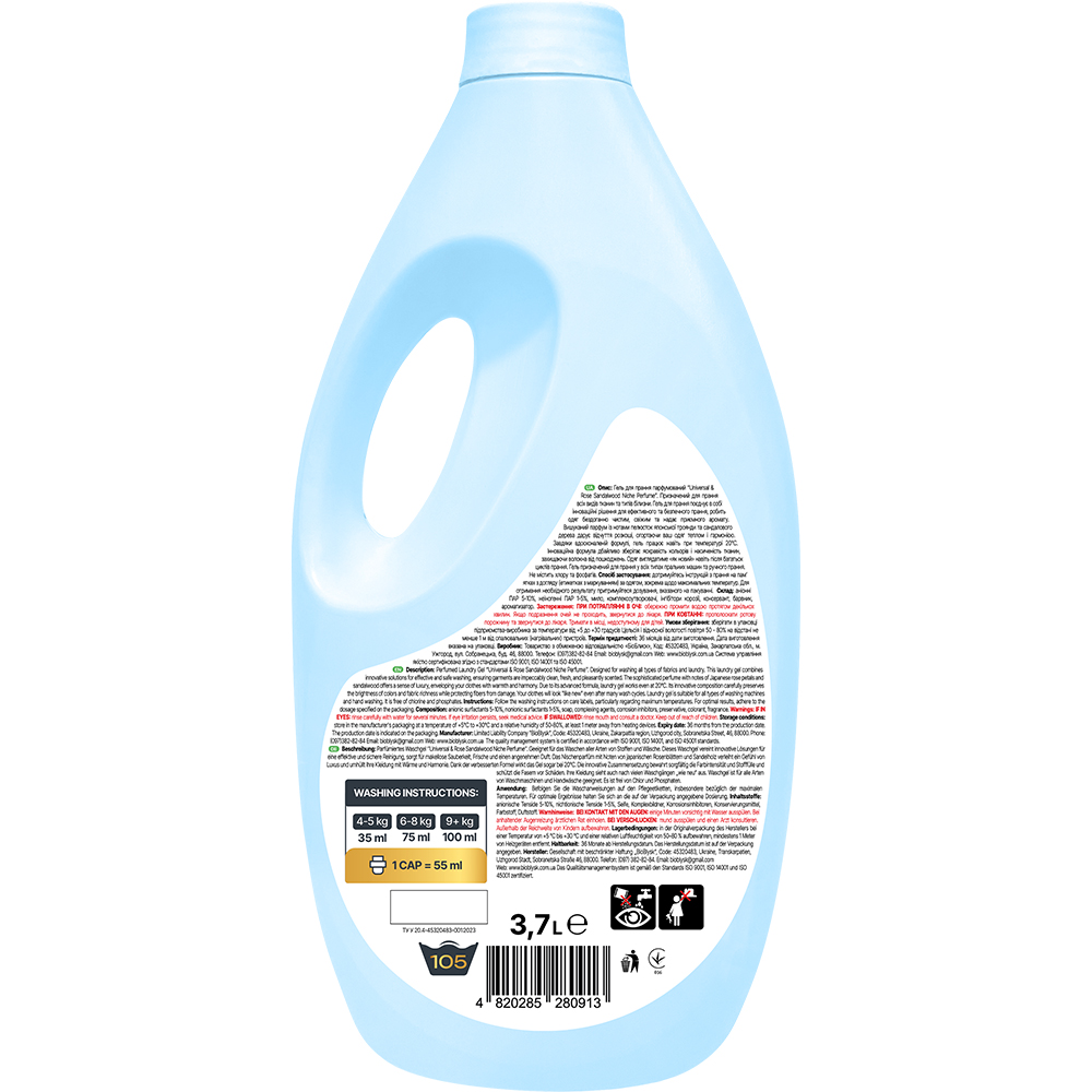 Wiping gel perfumed "Universal & Rose Sandalwood Niche Perfume". Designed for washing all types of fabrics and types of linen. The laundry gel combines innovative solutions for efficient and safe washing, makes clothes flawlessly clean, fresh and give a pleasant aroma. Exquisite perfume with notes of petals of Japanese rose and sandalwood gives a feeling of luxury, enveloping your clothes with warmth and harmony. Thanks to the improved formula, the gel works even at a temperature of 20 ° C. The innovative formula carefully preserves the brightness of colors and saturation of tissues, protecting the fibers from damage. Clothes will look "like new" even after many washing cycles. The gel is designed for washing in all types of washing machines and hand washing. Does not contain chlorine and phosphates.